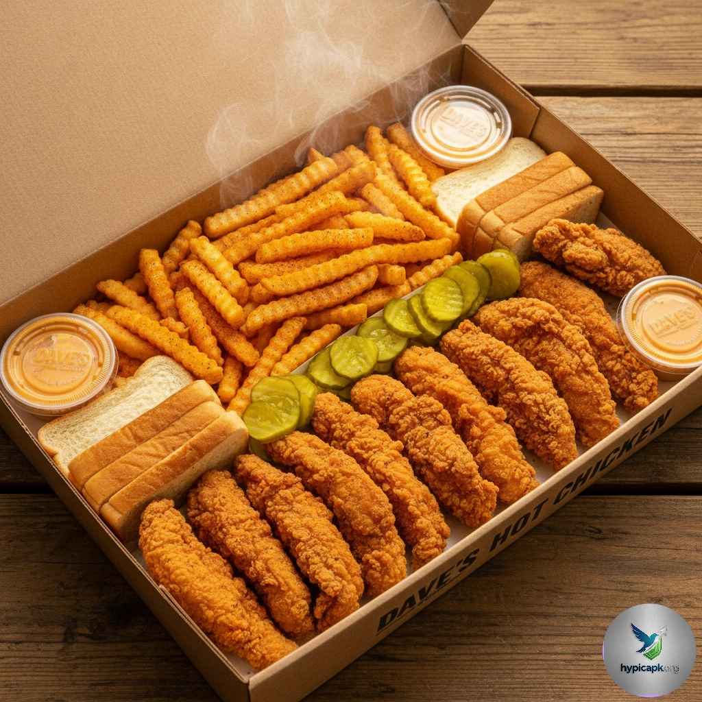 • Tenders & Fries Hot Box: This is the classic. Specifically, it features plenty of their juicy, seasoned chicken tenders served with sliced bread, pickles, and Dave’s Sauce, alongside a generous portion of seasoned fries. It’s perfect for casual gatherings where people want to grab-and-go.
